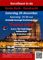 Kerstfeest in de Grote Kerk Met medewerking van: - Chr. Gemengd Drechtstedenkoor Praise Him - The Credo Singers uit Rotterdam en een deel van het Holland-Koor zullen met ons meezingen. - Bert Kruis – orgel - Marcel van der Poel – pianist - Jochem van der Oosterkamp - trompet - Noortje van Middelkoop –panfluit Passieconcert Met medewerking van: - Chr. Gemengd Drechtstedenkoor Praise Him o.l.v. Jan Quintus Zwart - André van Vliet - orgel - Kees de Bruin - piano Naderfe informatie volgt later.