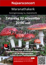 Najaarsconcert met medewerking van: - Chr. Gemengd Drechtstedenkoor Praise Him o.l.v Jan Quintus Zwart - Kees de Bruin - orgel Kaarten in de voorverkoop € 9,00 te bestellen via de QR-code op de poster (zie home-pagina). Kerk open om 19.30 uur, in de kerk kost een kaart € 10,00. Kinderen t/m 14 jaar in gezinsverband gratis. Kerstfeest in de Grote Kerk Met medewerking van: - Chr. Gemengd Drechtstedenkoor Praise Him - The Credo Singers uit Rotterdam en een deel van het Holland-Koor zullen met ons meezingen. - Bert Kruis – orgel - Marcel van der Poel – pianist / solist - Noortje van Middelkoop –panfluit. Passieconcert Met medewerking van: - Chr. Gemengd Drechtstedenkoor Praise Him o.l.v. Jan Quintus Zwart - André van Vliet - orgel - Kees de Bruin - piano Naderfe informatie volgt later.
